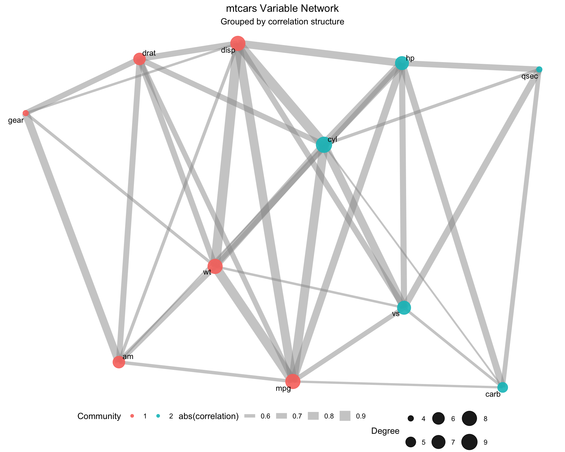 Communities reveal natural groupings: Automated algorithms partition variables into clusters with strong internal associations.