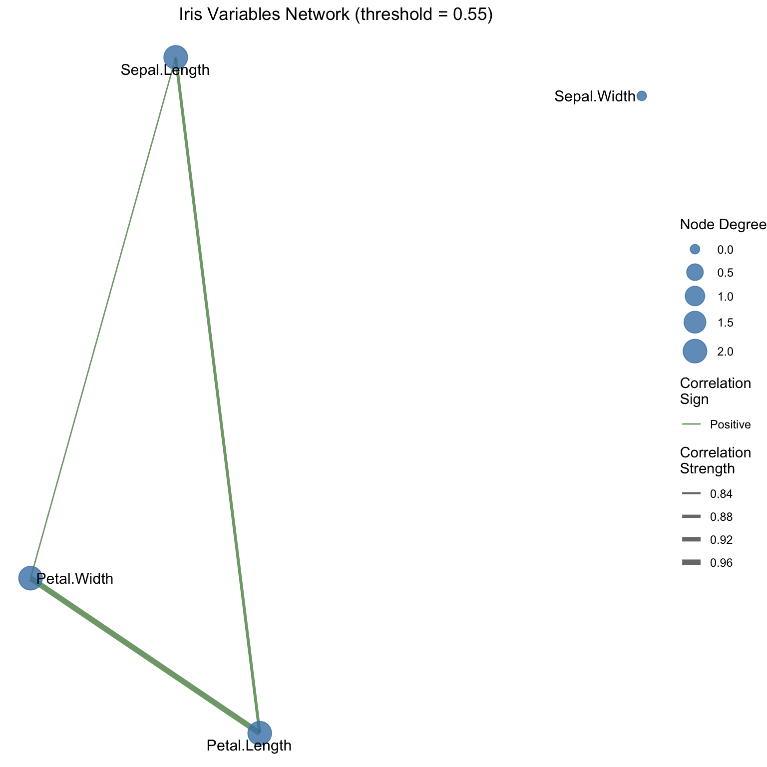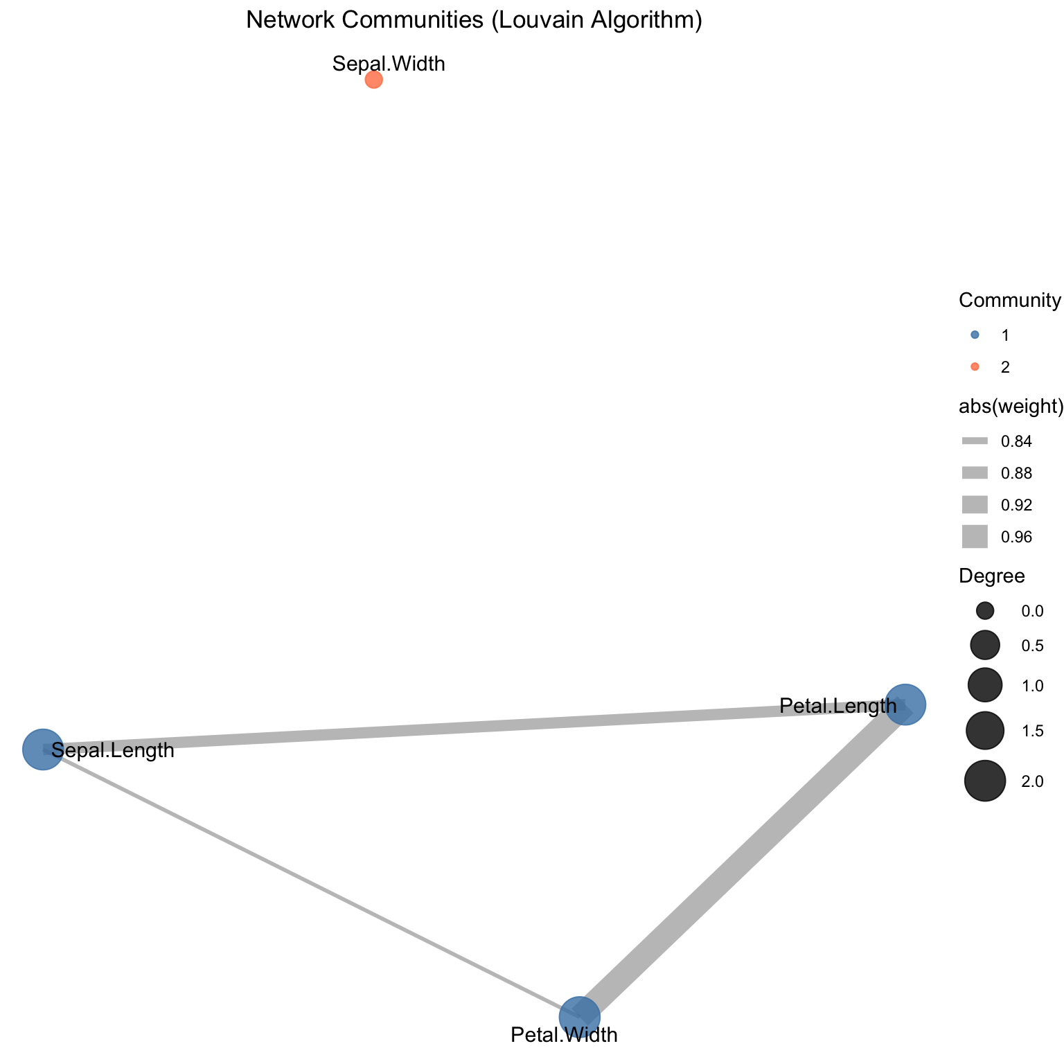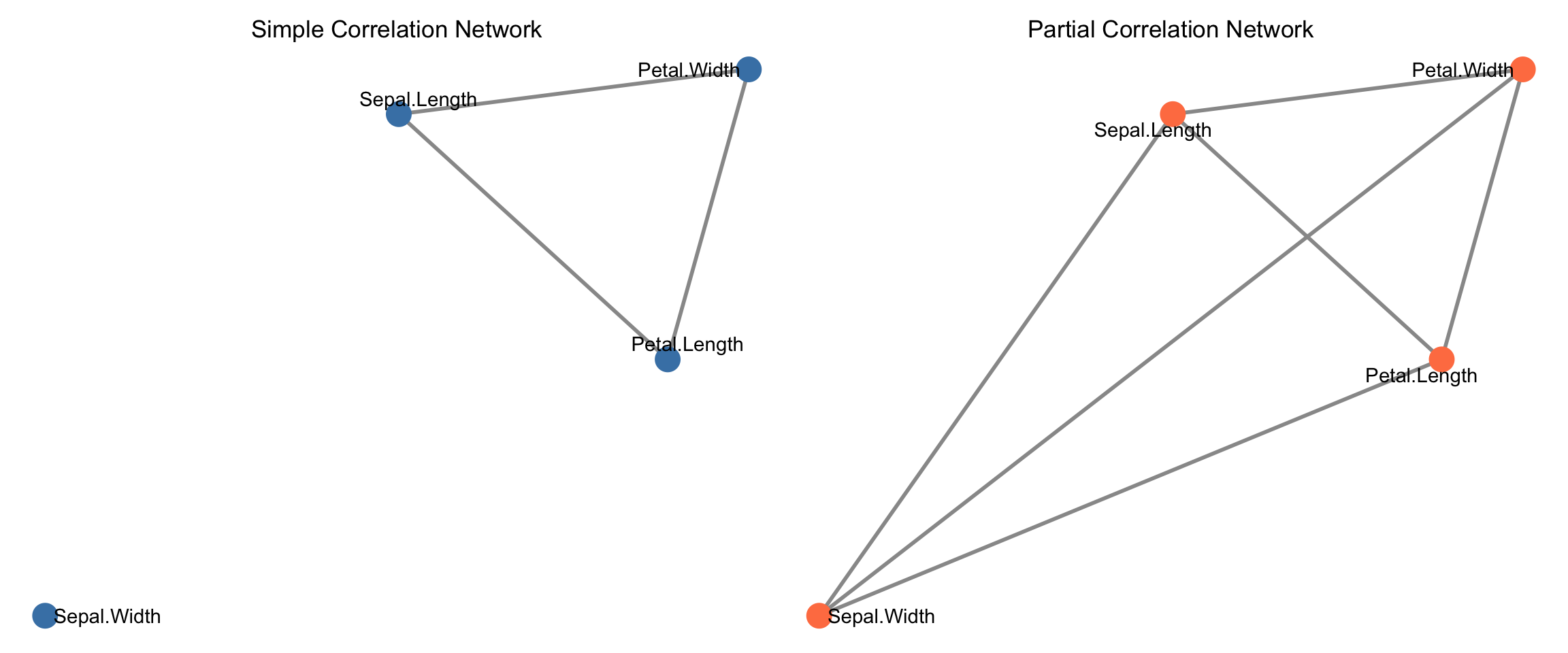 # Note: Partial correlation computation often uses inverse covariance# For this example, we'll demonstrate the concept with a simplified approach# using residuals from regressioncompute_partial_corr_approx <-function(data) { n_vars <-ncol(data) partial_corr <-matrix(1, n_vars, n_vars)colnames(partial_corr) <-colnames(data)rownames(partial_corr) <-colnames(data)if (n_vars <2) {return(partial_corr) }for (i in1:(n_vars -1)) {for (j in (i +1):n_vars) {# Residuals of X_i after removing effects of other variables x_other <- data[, -c(i, j), drop =FALSE]# Create a data frame with response and predictors for regression df_i <-cbind(data[, i, drop =FALSE], x_other)colnames(df_i)[1] <-"y" fit_i <-lm(y ~ ., data = df_i) resid_i <-residuals(fit_i)# Residuals of X_j after removing effects of other variables df_j <-cbind(data[, j, drop =FALSE], x_other)colnames(df_j)[1] <-"y" fit_j <-lm(y ~ ., data = df_j) resid_j <-residuals(fit_j)# Correlation of residuals partial_corr[i, j] <-cor(resid_i, resid_j) partial_corr[j, i] <-cor(resid_i, resid_j) } } partial_corr}# Compute partial correlationspartial_cor_iris <-compute_partial_corr_approx(iris_numeric)# Create network from partial correlationsthreshold_partial <-0.3adj_partial <- (abs(partial_cor_iris) > threshold_partial) *1diag(adj_partial) <-0net_partial <-graph_from_adjacency_matrix( adj_partial,mode ="undirected",diag =FALSE)# Extract and assign edge weightsedge_list_partial <-as_edgelist(net_partial)edge_weights_partial <-numeric(nrow(edge_list_partial))for (i in1:nrow(edge_list_partial)) { edge_weights_partial[i] <- partial_cor_iris[edge_list_partial[i, 1], edge_list_partial[i, 2]]}E(net_partial)$weight <-abs(edge_weights_partial)cat("\nPartial Correlation Network Properties:\n")