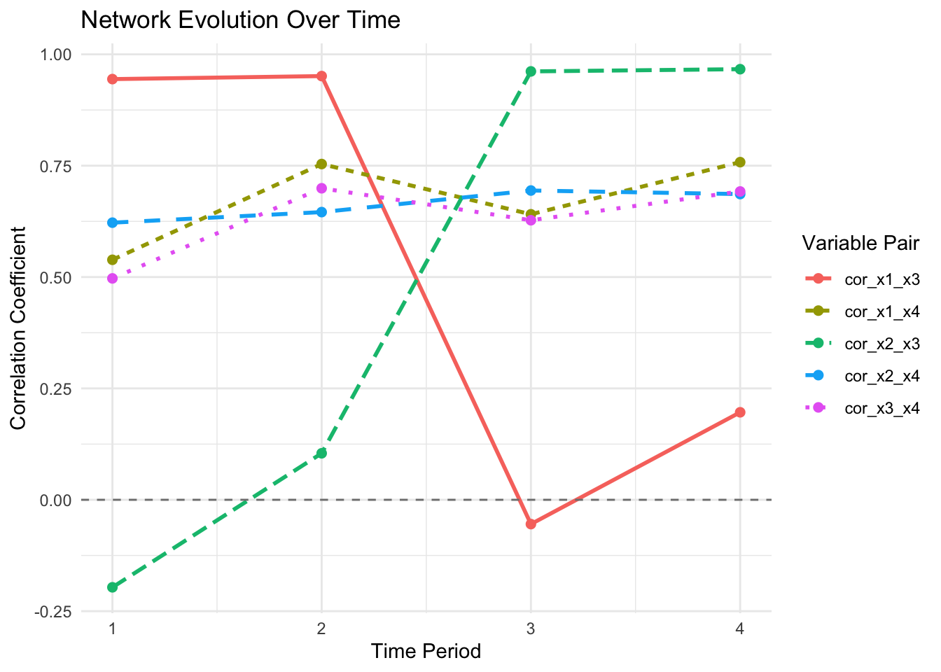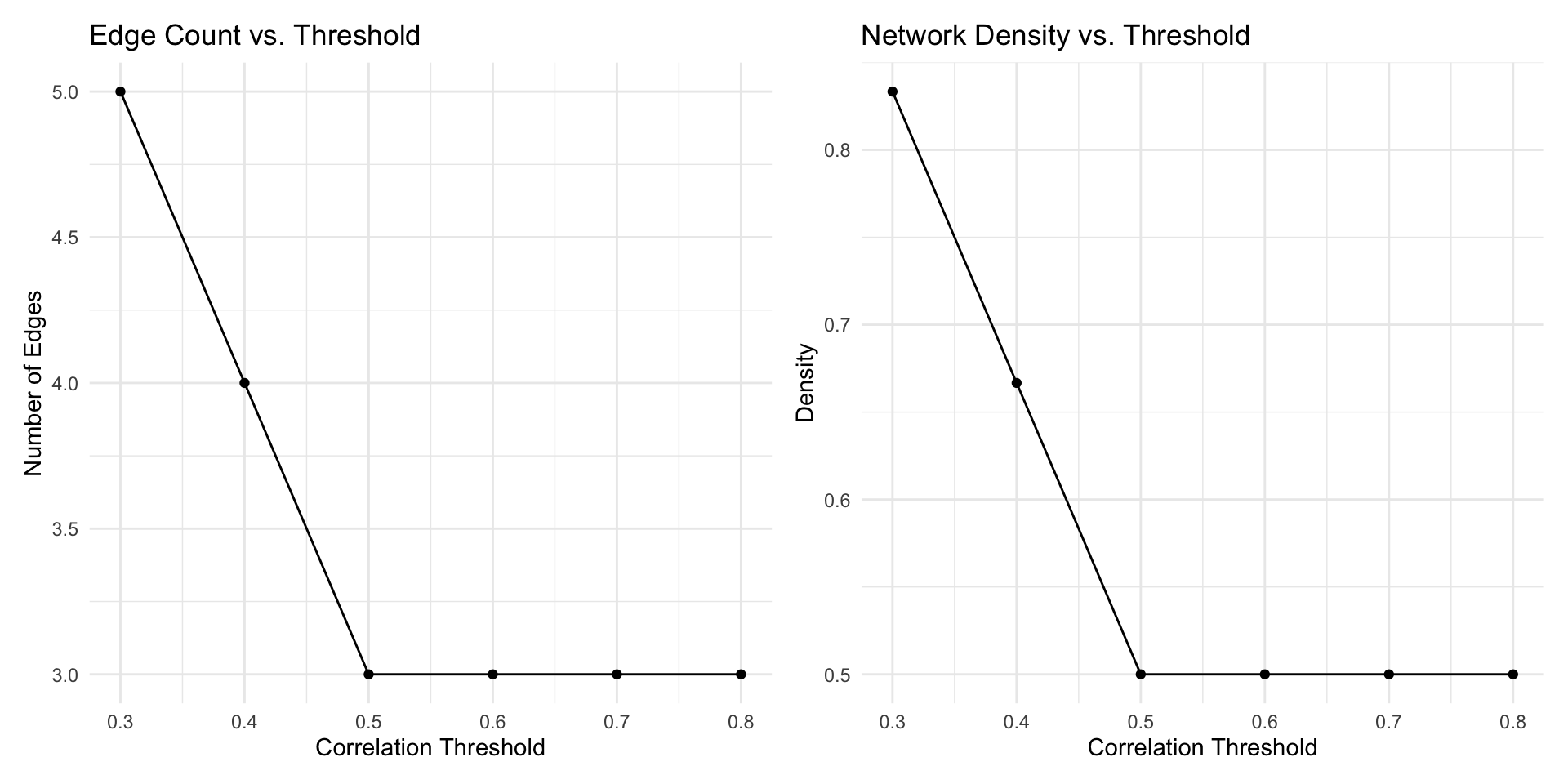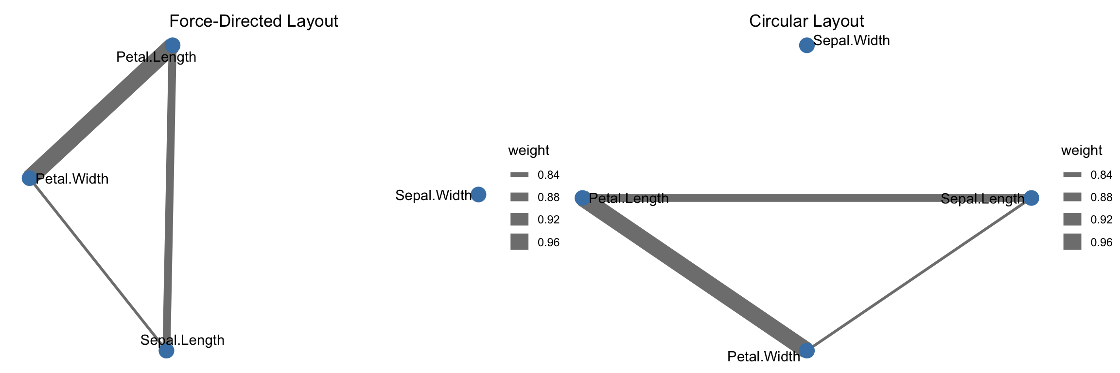 # Note: Partial correlation computation often uses inverse covariance# For this example, we'll demonstrate the concept with a simplified approach# using residuals from regressioncompute_partial_corr_approx <-function(data) { n_vars <-ncol(data) partial_corr <-matrix(1, n_vars, n_vars)colnames(partial_corr) <-colnames(data)rownames(partial_corr) <-colnames(data)if (n_vars <2) {return(partial_corr) }for (i in1:(n_vars -1)) {for (j in (i +1):n_vars) {# Residuals of X_i after removing effects of other variables x_other <- data[, -c(i, j), drop =FALSE]# Create a data frame with response and predictors for regression df_i <-cbind(data[, i, drop =FALSE], x_other)colnames(df_i)[1] <-"y" fit_i <-lm(y ~ ., data = df_i) resid_i <-residuals(fit_i)# Residuals of X_j after removing effects of other variables df_j <-cbind(data[, j, drop =FALSE], x_other)colnames(df_j)[1] <-"y" fit_j <-lm(y ~ ., data = df_j) resid_j <-residuals(fit_j)# Correlation of residuals partial_corr[i, j] <-cor(resid_i, resid_j) partial_corr[j, i] <-cor(resid_i, resid_j) } } partial_corr}# Compute partial correlationspartial_cor_iris <-compute_partial_corr_approx(iris_numeric)# Create network from partial correlationsthreshold_partial <-0.3adj_partial <- (abs(partial_cor_iris) > threshold_partial) *1diag(adj_partial) <-0net_partial <-graph_from_adjacency_matrix( adj_partial,mode ="undirected",diag =FALSE)# Extract and assign edge weightsedge_list_partial <-as_edgelist(net_partial)edge_weights_partial <-numeric(nrow(edge_list_partial))for (i in1:nrow(edge_list_partial)) { edge_weights_partial[i] <- partial_cor_iris[edge_list_partial[i, 1], edge_list_partial[i, 2]]}E(net_partial)$weight <-abs(edge_weights_partial)cat("\nPartial Correlation Network Properties:\n")