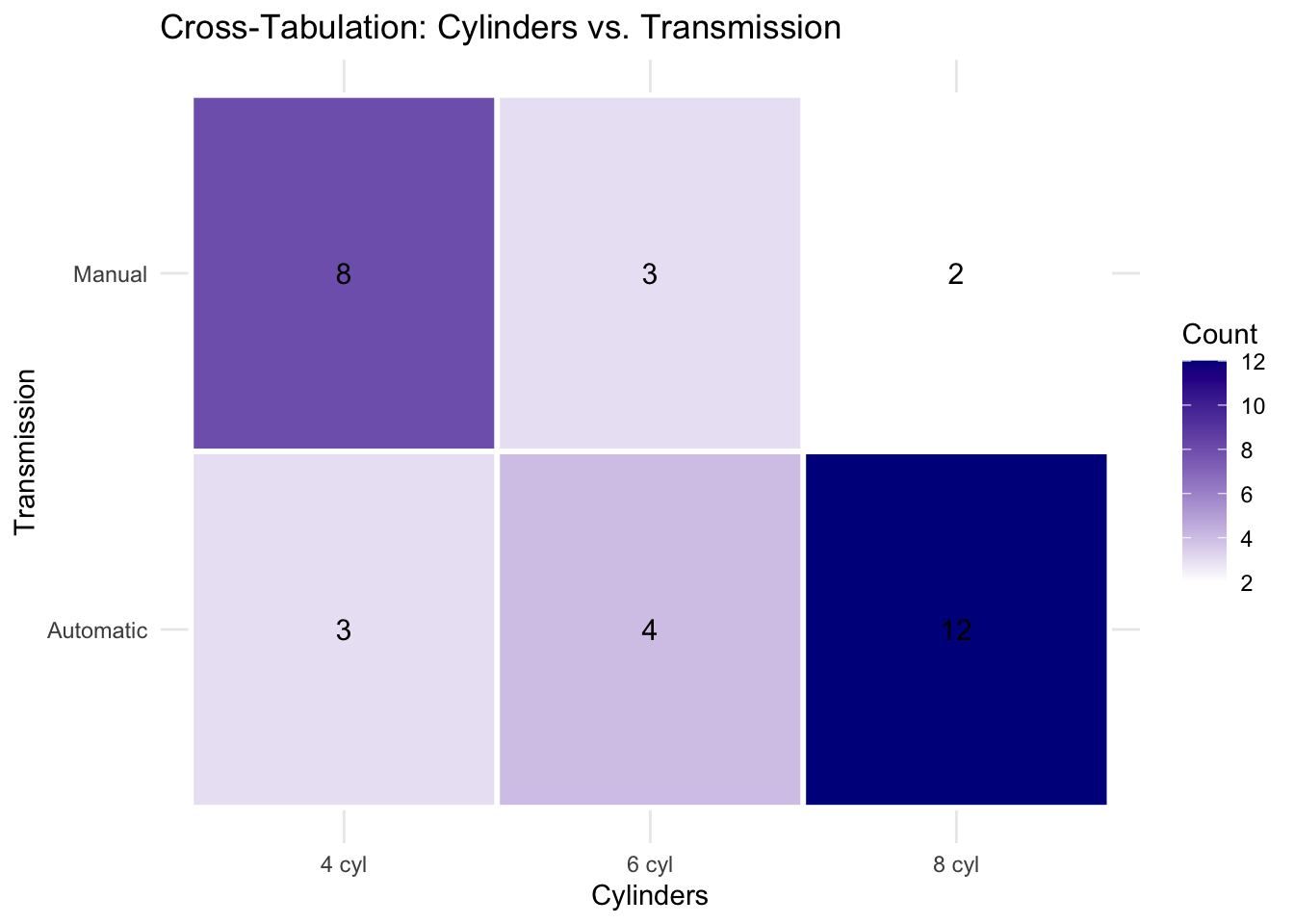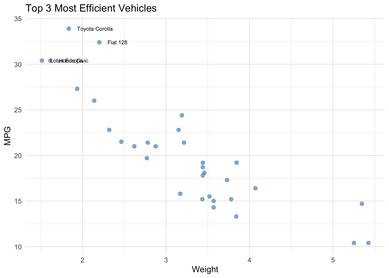 Academic framing: “Among 32 vehicles, a strong negative correlation (\(r = -0.87\), 95% CI \([-0.93, -0.74]\)) exists between weight and fuel efficiency, suggesting that vehicle mass is a significant determinant of energy consumption.”