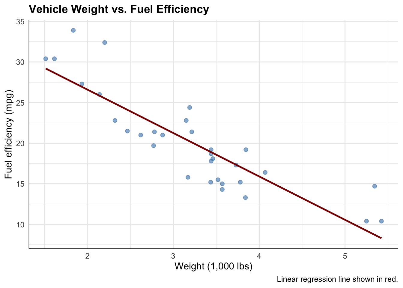 # Clean, minimal scatterplotmtcars |>ggplot(aes(x = wt, y = mpg)) +geom_point(alpha =0.6, size =2, color ="steelblue") +geom_smooth(method ="lm", se =FALSE, color ="darkred", linewidth =1) +labs(title ="Vehicle Weight vs. Fuel Efficiency",x ="Weight (1,000 lbs)",y ="Fuel efficiency (mpg)",caption ="Linear regression line shown in red." ) +theme_minimal(base_size =12) +theme(plot.title =element_text(face ="bold", size =14),axis.line =element_line(color ="gray20", linewidth =0.3) )