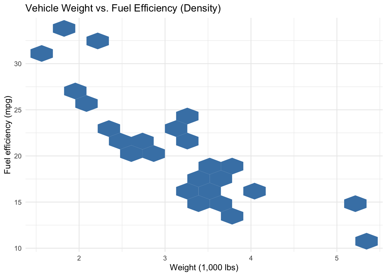 # Heatmap version for many overlapping pointsmtcars |>ggplot(aes(x = wt, y = mpg)) +geom_hex(bins =15, fill ="steelblue") +scale_fill_gradient(low ="white", high ="darkblue", name ="Count") +labs(title ="Vehicle Weight vs. Fuel Efficiency (Density)",x ="Weight (1,000 lbs)",y ="Fuel efficiency (mpg)" ) +theme_minimal()