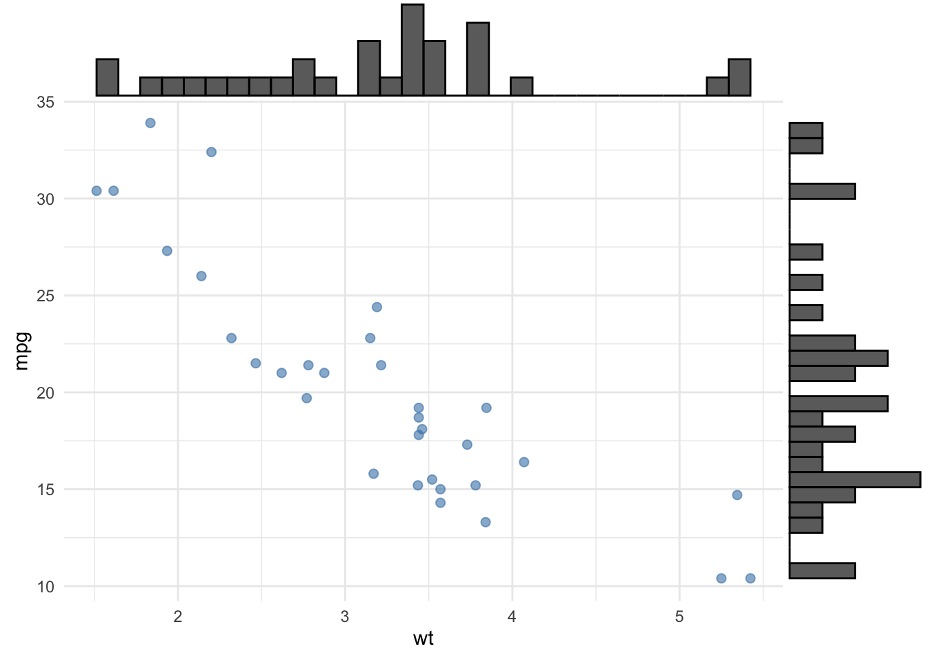 # Scatterplot with marginal histograms (using ggExtra or similar)base_plot <- mtcars |>ggplot(aes(x = wt, y = mpg)) +geom_point(alpha =0.6, size =2, color ="steelblue") +theme_minimal()# Combine with marginal histograms (pseudo-code)ggExtra::ggMarginal(base_plot, type ="histogram", margins ="both")