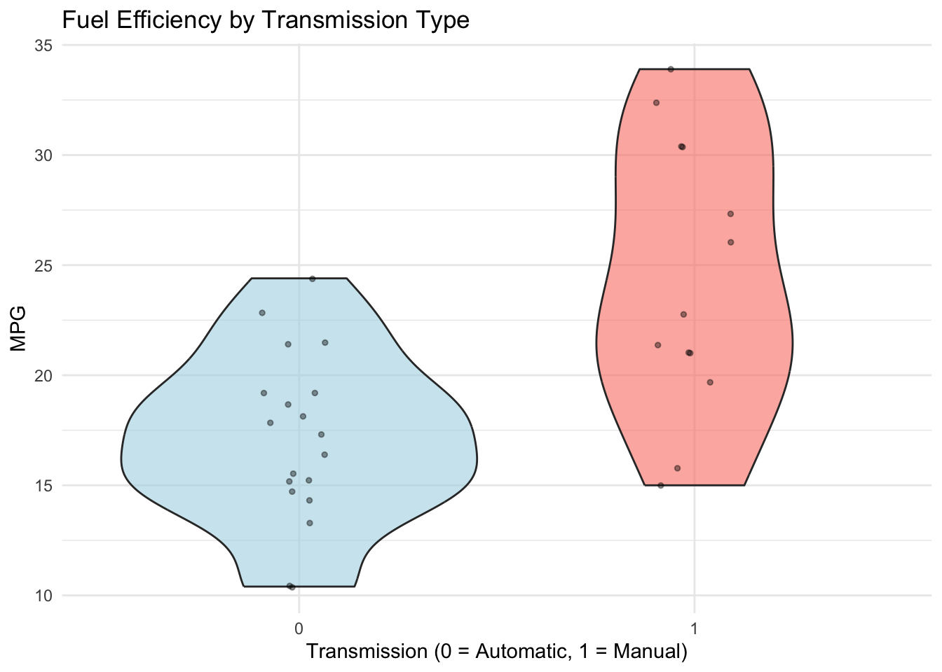 # Violin plot: full density by categorymtcars |>ggplot(aes(x =factor(am), y = mpg, fill =factor(am))) +geom_violin(alpha =0.6) +geom_jitter(width =0.1, alpha =0.4, size =1) +scale_fill_manual(values =c("lightblue", "salmon"), guide ="none") +labs(title ="Fuel Efficiency by Transmission Type",x ="Transmission (0 = Automatic, 1 = Manual)",y ="MPG" ) +theme_minimal()