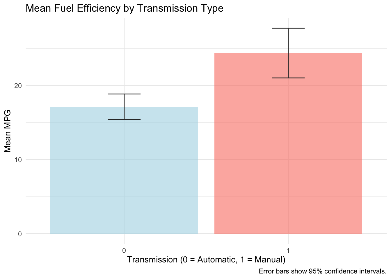 # Mean with error bars (SE or CI)mtcars |>group_by(am) |>summarise(mean_mpg =mean(mpg),se =sd(mpg) /sqrt(n()),.groups ="drop" ) |>ggplot(aes(x =factor(am), y = mean_mpg, fill =factor(am))) +geom_col(alpha =0.6) +geom_errorbar(aes(ymin = mean_mpg -1.96* se, ymax = mean_mpg +1.96* se),width =0.2, color ="gray20") +scale_fill_manual(values =c("lightblue", "salmon"), guide ="none") +labs(title ="Mean Fuel Efficiency by Transmission Type",x ="Transmission (0 = Automatic, 1 = Manual)",y ="Mean MPG",caption ="Error bars show 95% confidence intervals." ) +theme_minimal()