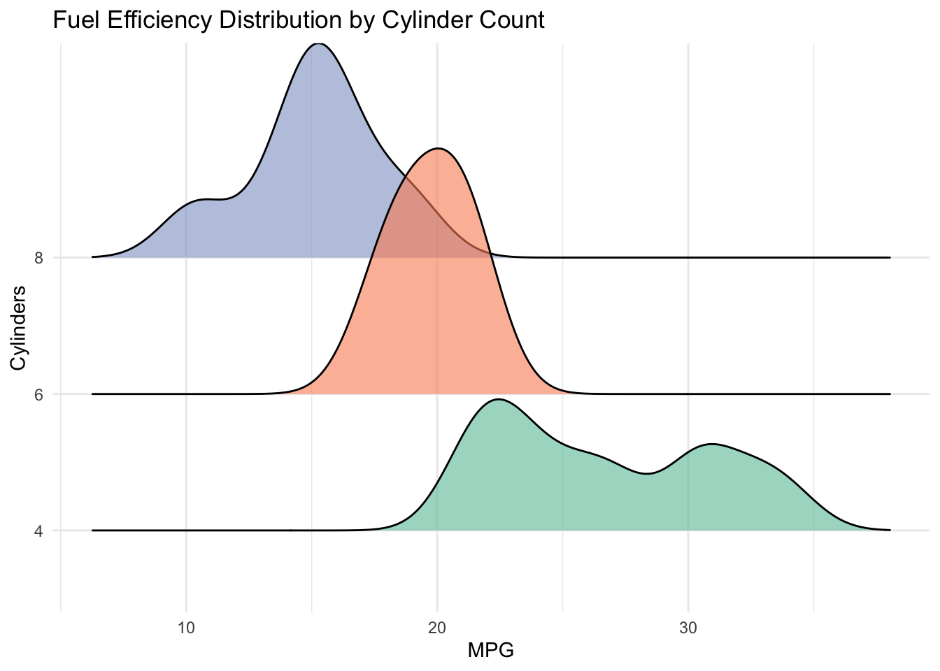 # Ridgeline: density for each categorymtcars |>ggplot(aes(x = mpg, y =factor(cyl), fill =factor(cyl))) +geom_density_ridges(alpha =0.6) +scale_fill_brewer(palette ="Set2", guide ="none") +labs(title ="Fuel Efficiency Distribution by Cylinder Count",x ="MPG",y ="Cylinders" ) +theme_minimal()