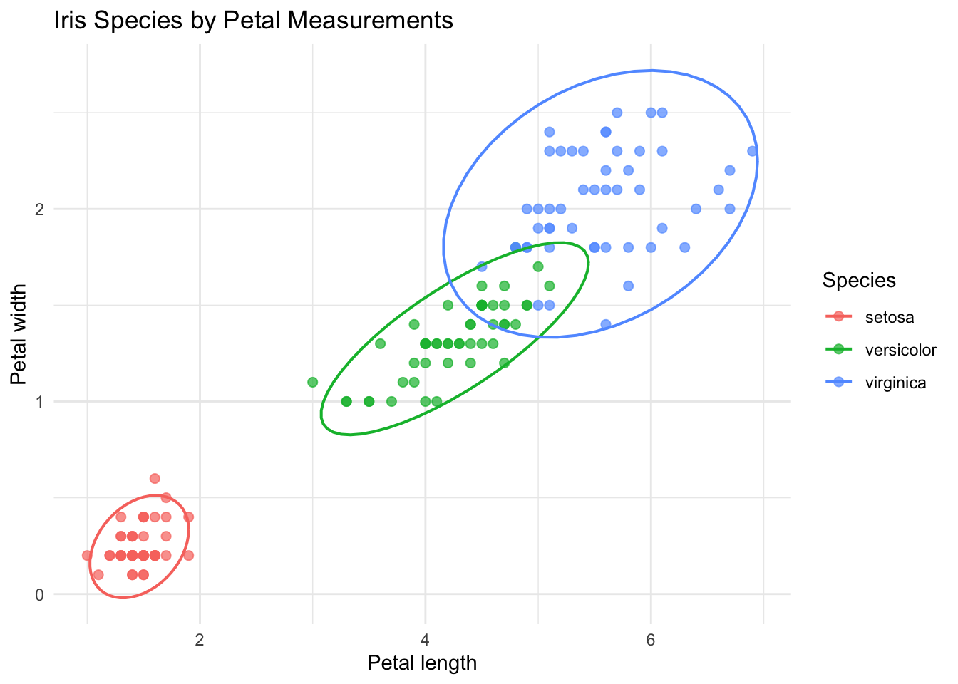 iris |>ggplot(aes(x = Petal.Length, y = Petal.Width, color = Species)) +geom_point(alpha =0.7, size =2) +stat_ellipse(type ="norm", linewidth =0.7) +labs(title ="Iris Species by Petal Measurements",x ="Petal length",y ="Petal width" ) +theme_minimal()