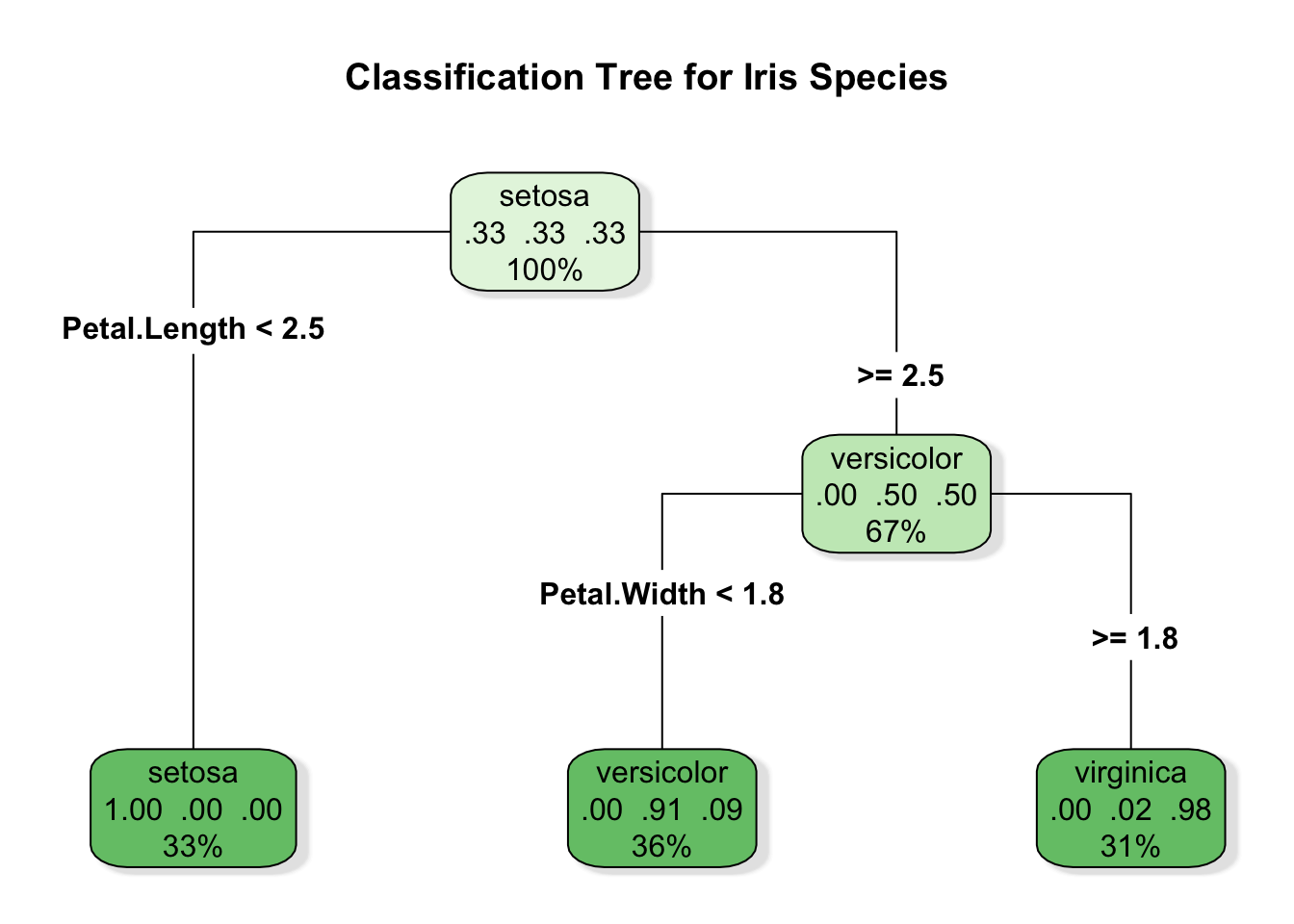 We use the classic iris dataset. The response is species, and the predictors are the four flower measurements. The dataset is small enough to examine directly, and it produces a compact tree.