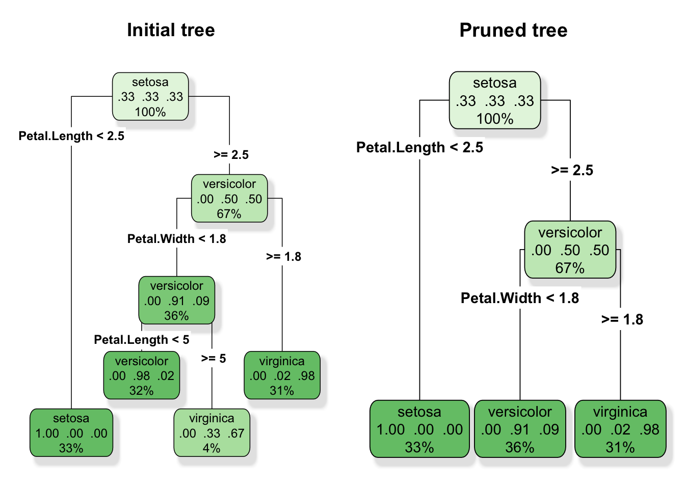 To see the effect of pruning more directly, we can compare the initial tree to the pruned tree side by side. The pruned version is smaller, with fewer terminal nodes and clearer rules.