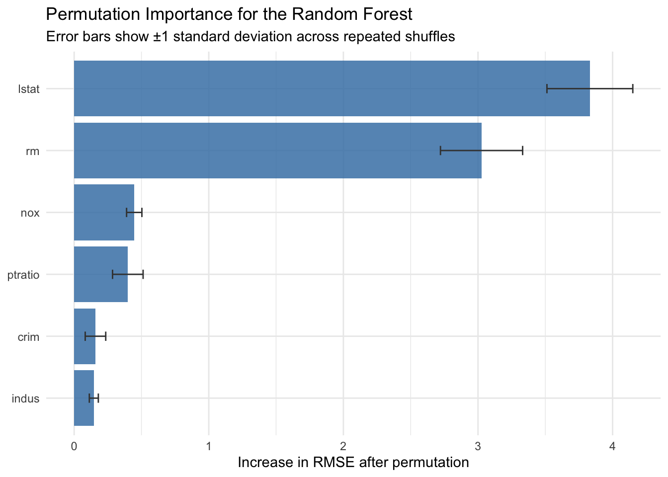 We now implement this procedure for our random forest model. We define a function that computes permutation importance for each predictor by repeatedly shuffling it and recording the change in test RMSE. We then apply this function to all six predictors and visualize the results to identify which features the model relies on most heavily.