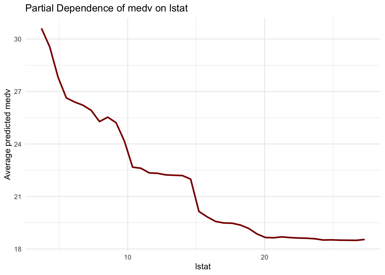This curve describes model behavior, not a causal response curve. It is best interpreted as a summary of how predictions tend to vary with lstat within the observed data region.