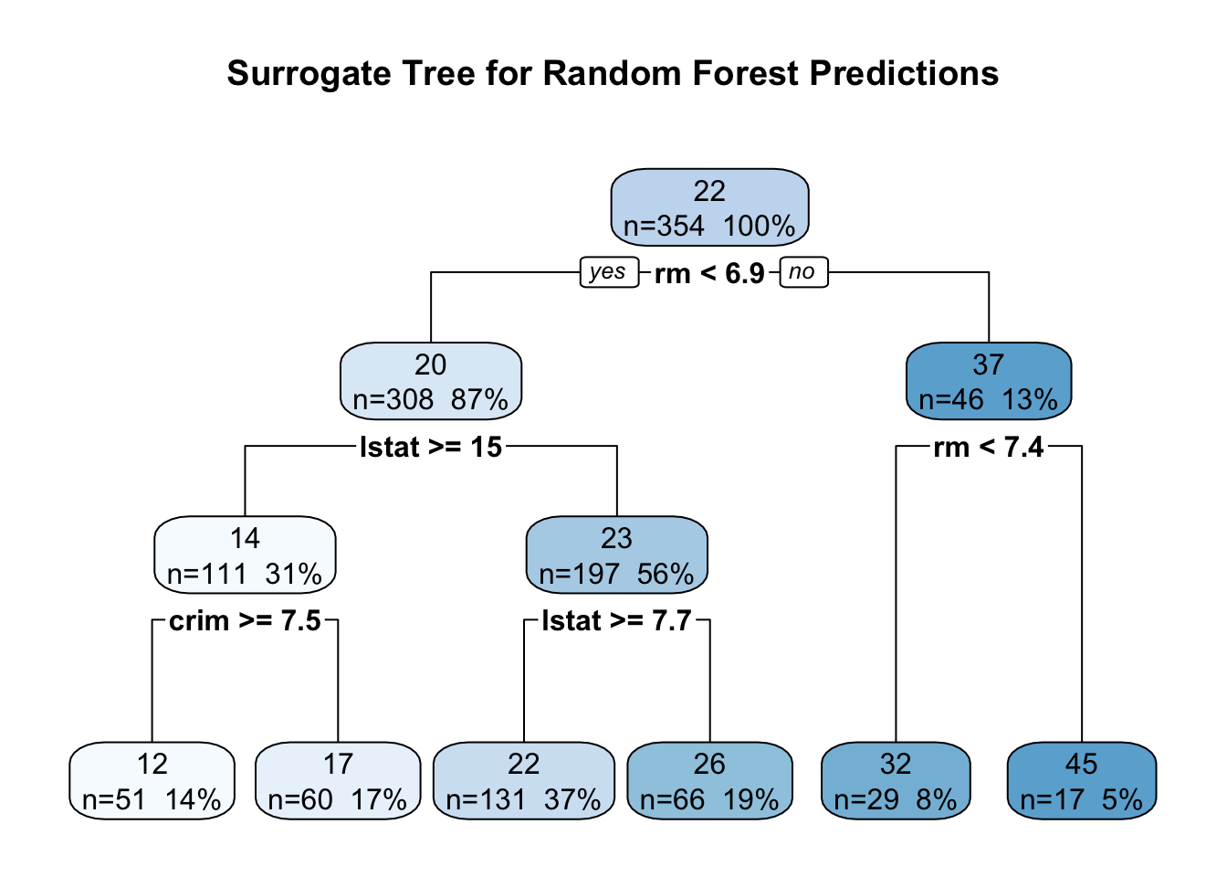Another common strategy is to fit an interpretable surrogate model to predictions from a complex model. Here we fit a shallow regression tree to random forest predictions.