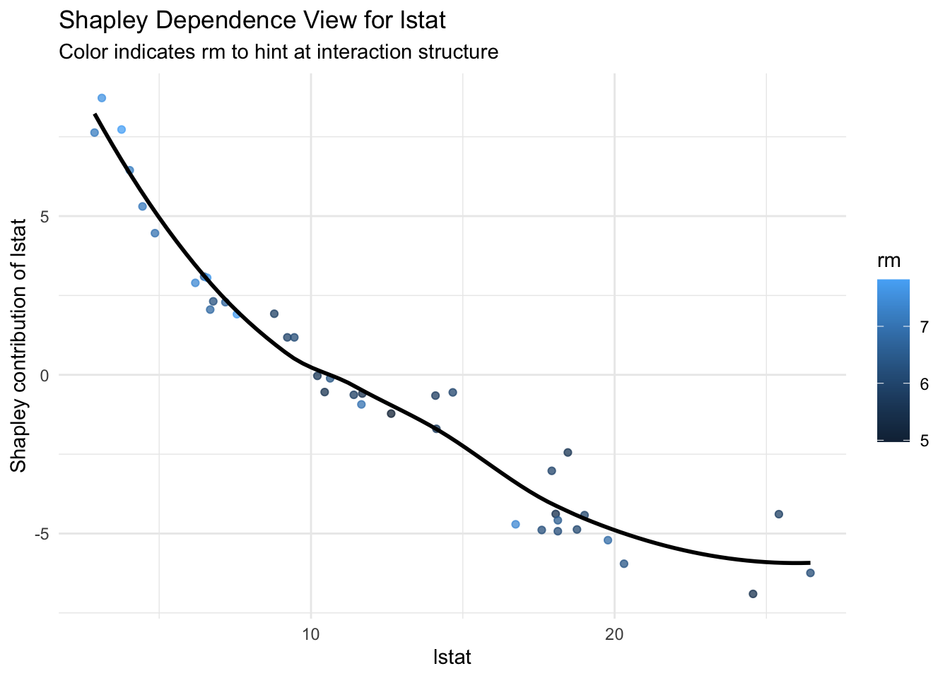 dep_tbl <- shap_values |>mutate(lstat_value = test$lstat[obs_id],rm_value = test$rm[obs_id] )dep_tbl |>ggplot(aes(x = lstat_value, y = lstat, color = rm_value)) +geom_point(alpha =0.75) +geom_smooth(method ="loess", se =FALSE, color ="black") +labs(title ="Shapley Dependence View for lstat",subtitle ="Color indicates rm to hint at interaction structure",x ="lstat",y ="Shapley contribution of lstat",color ="rm" ) +theme_minimal()