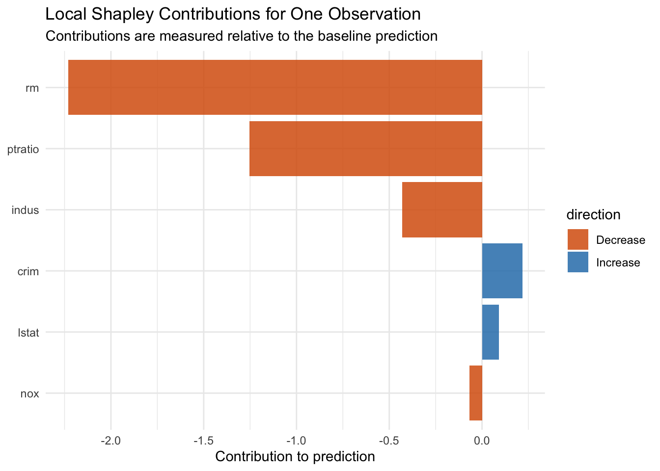 plot_tbl <- local_tbl |>mutate(direction =ifelse(phi >=0, "Increase", "Decrease"),feature =factor(feature, levels =rev(feature)) )plot_tbl |>ggplot(aes(x = feature, y = phi, fill = direction)) +geom_col(alpha =0.85) +coord_flip() +scale_fill_manual(values =c("Increase"="#2c7fb8", "Decrease"="#d95f0e")) +labs(title ="Local Shapley Contributions for One Observation",subtitle ="Contributions are measured relative to the baseline prediction",x =NULL,y ="Contribution to prediction" ) +theme_minimal()