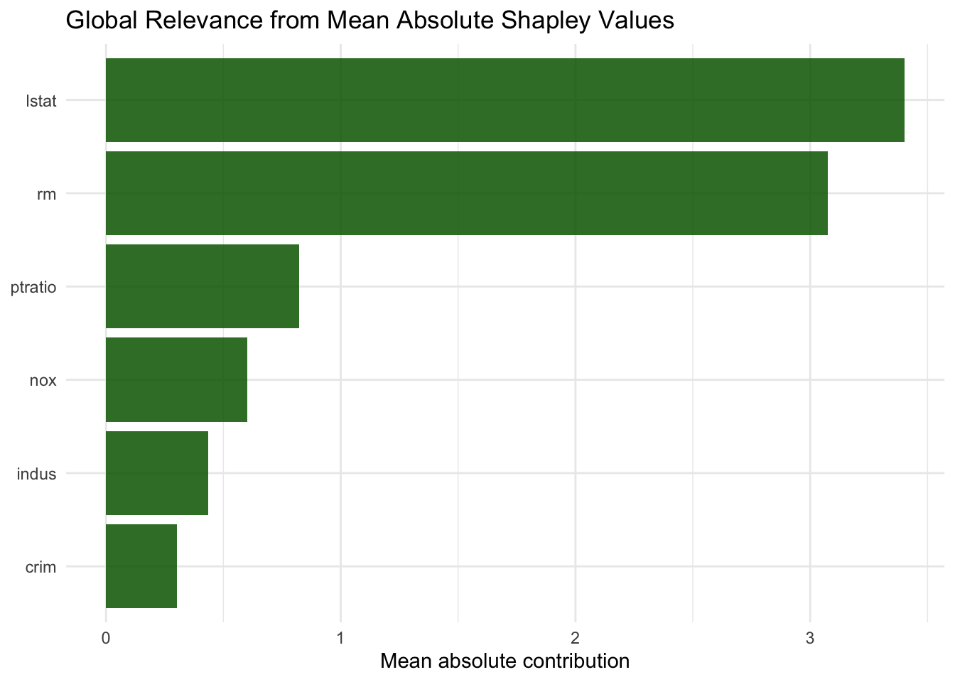 global_shap |>ggplot(aes(x =reorder(feature, mean_abs_phi), y = mean_abs_phi)) +geom_col(fill ="darkgreen", alpha =0.85) +coord_flip() +labs(title ="Global Relevance from Mean Absolute Shapley Values",x =NULL,y ="Mean absolute contribution" ) +theme_minimal()