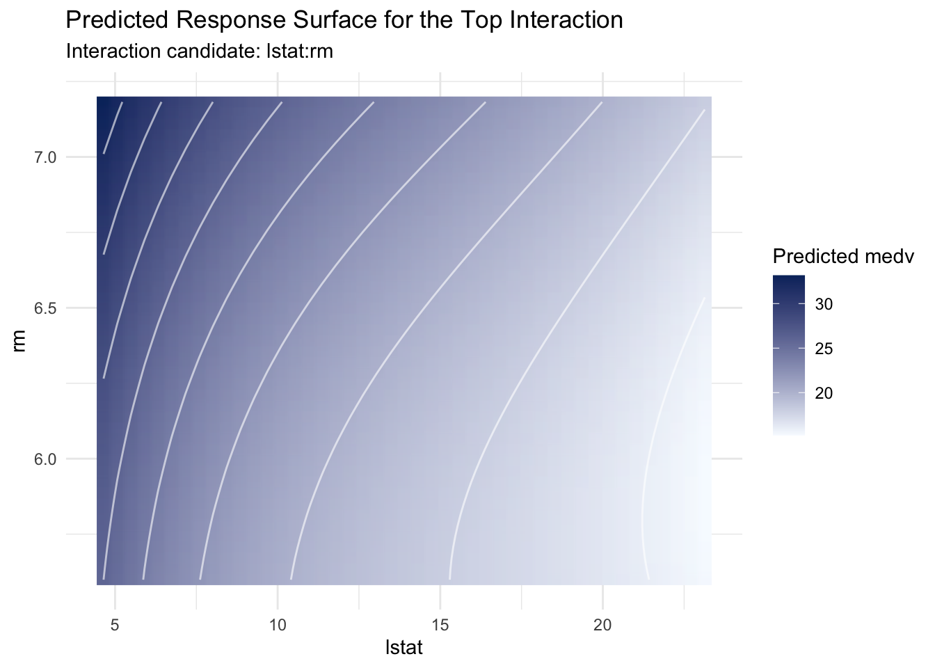 if (nrow(top_interaction) ==1) { vars <-strsplit(top_interaction$term[1], ":", fixed =TRUE)[[1]] v1 <- vars[1] v2 <- vars[2] grid_v1 <-seq(as.numeric(quantile(analysis_data[[v1]], 0.1)),as.numeric(quantile(analysis_data[[v1]], 0.9)),length.out =45 ) grid_v2 <-seq(as.numeric(quantile(analysis_data[[v2]], 0.1)),as.numeric(quantile(analysis_data[[v2]], 0.9)),length.out =45 ) surface_data <-expand.grid(x1 = grid_v1,x2 = grid_v2 )names(surface_data) <-c(v1, v2)for (p in predictors) {if (!(p %in%c(v1, v2))) { surface_data[[p]] <-median(analysis_data[[p]]) } } surface_data$pred <-as.numeric(predict(engineered_fit, newdata = surface_data)) surface_data |>ggplot(aes(x = .data[[v1]], y = .data[[v2]], z = pred, fill = pred)) +geom_raster(interpolate =TRUE) +geom_contour(color ="white", alpha =0.6) +scale_fill_gradient(low ="#f7fbff", high ="#08306b") +labs(title ="Predicted Response Surface for the Top Interaction",subtitle =paste("Interaction candidate:", top_interaction$term[1]),x = v1,y = v2,fill ="Predicted medv" ) +theme_minimal()}